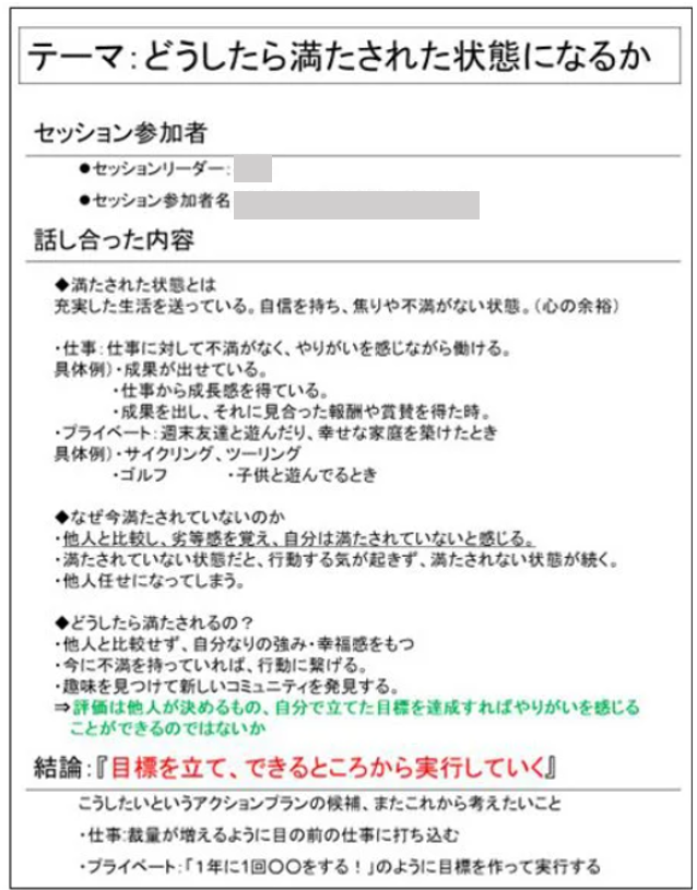 始めは普段の仕事ができないという焦りやもどかしさがあり、研修に集中しきれていない方もいましたが、ワークを進めていくうちに、内省を深め、自分の将来について考える時間になっていました。