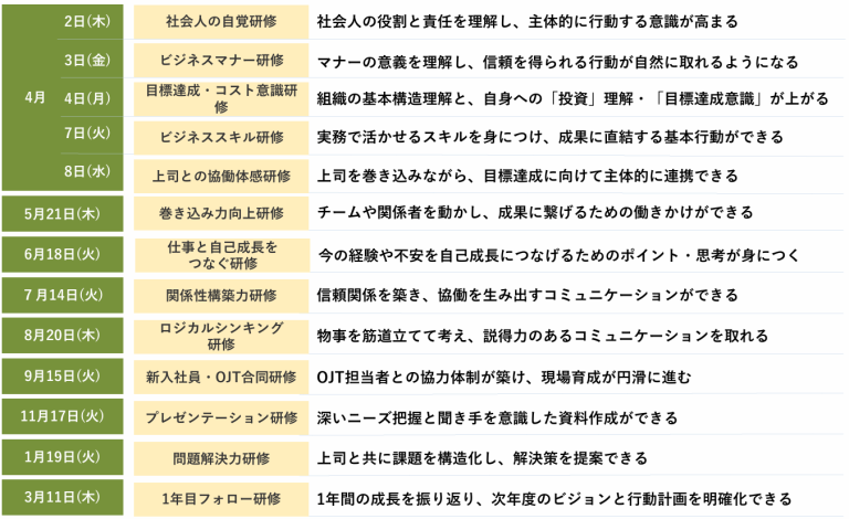当社では、4月で研修が終わりではなく、一年間新入社員研修を用意しています。新入社員にあった研修を選択することができ、年間を通して必要なフォローを実施できます。