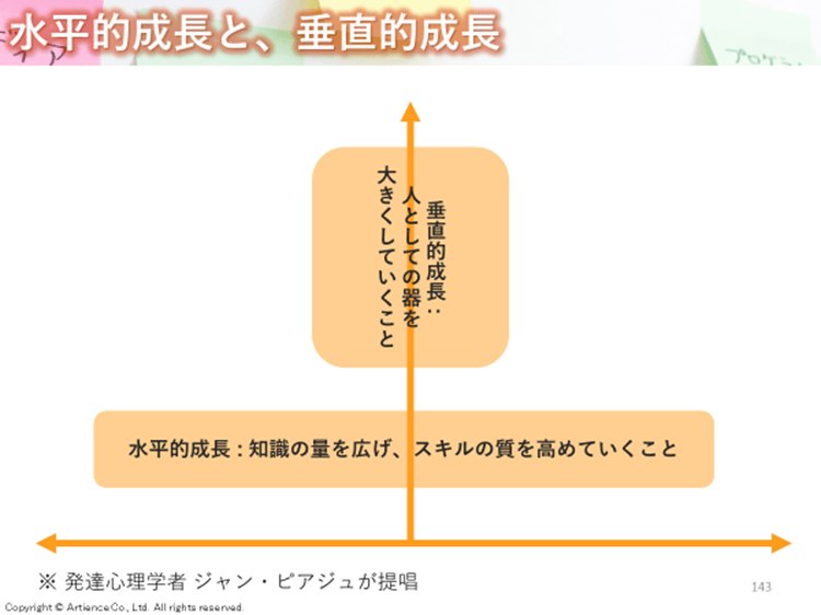 「あり方」や「態度」につながる精神的成長は、成人発達理論でいう垂直的成長に該当し、一朝一夕には身につかないものです。