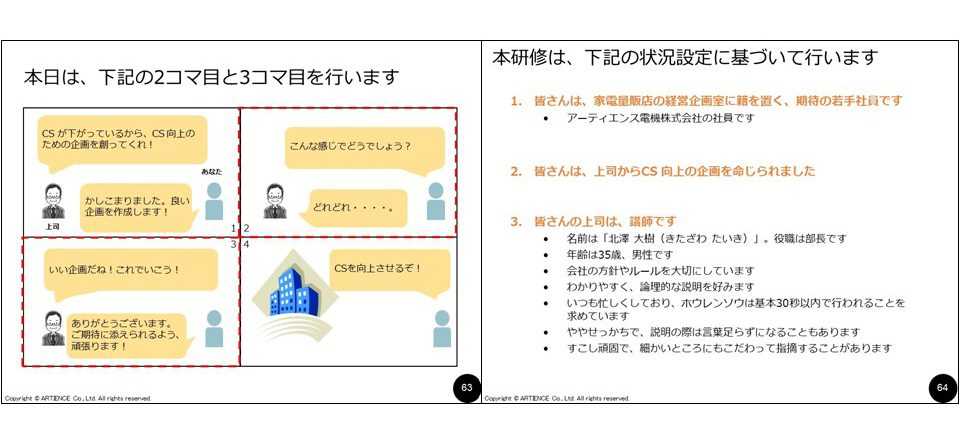 例えば、アーティエンスのロジカルシンキング研修では、「CS向上のための企画を考える課題」に取り組みます。
