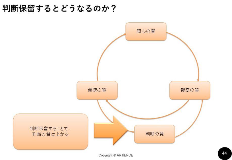判断保留とは、良い悪い・好き嫌いといった評価をすぐに下さず、まずはありのままを受け止めて観ることです。