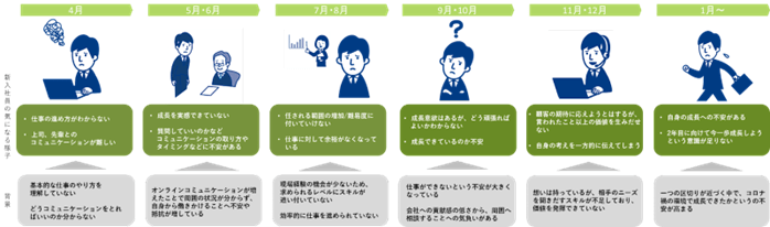 新入社員は入社からの数か月で「現場適応」「関係構築」「成果創出」など段階ごとに異なる悩みを抱えます。