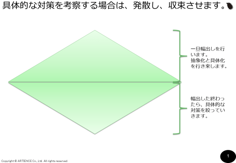 アーティエンスの問題解決研修では、「発散と収束」のフレームワークを活用しながら、複数のツールを用いてアイデアを広げ、効果的な解決策を絞り込んでいきます。