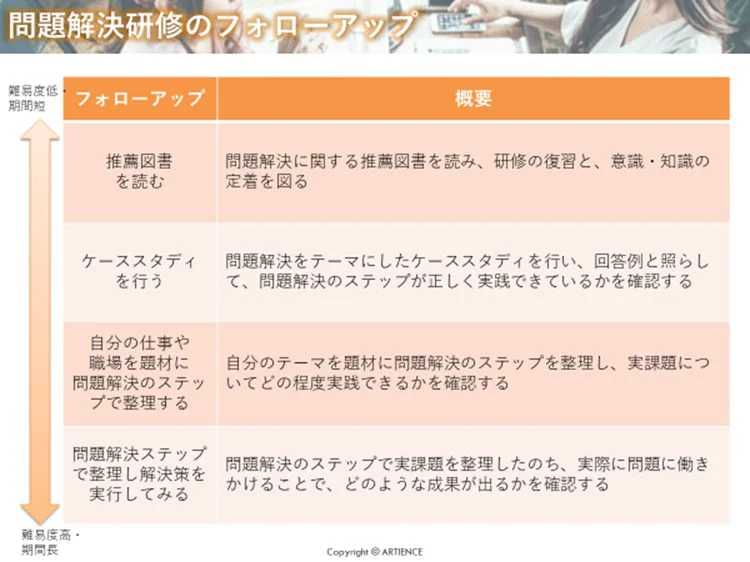 最も効果的なフォローアップは、研修で学んだ問題解決のステップを使って実際の課題を整理し、そのうえで解決策の実行まで取り組むことです。