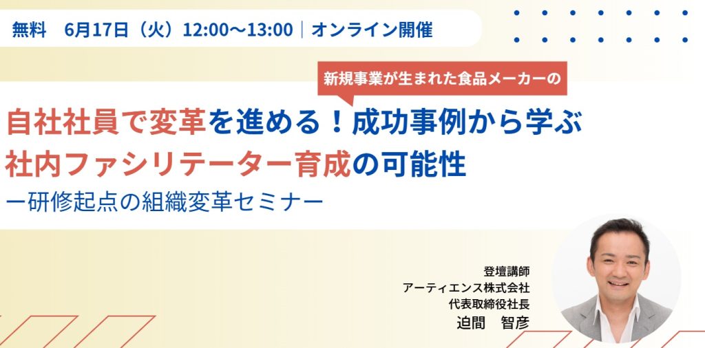 本セミナーでは、食品メーカーで実際に行われた社内ファシリテーター育成と組織変革の事例をもとに、具体的な手法を学びます。