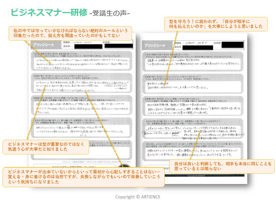 自身の個性(強み)をビジネスマナーにおいて発揮できることを認識し、相手目線を意識しながらも、ビジネスマナーを扱うことへの不安が軽減されている。